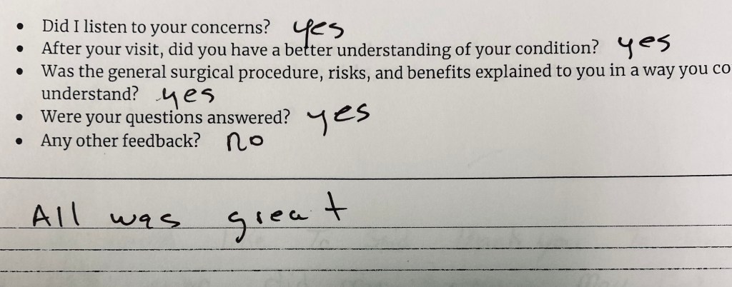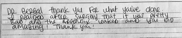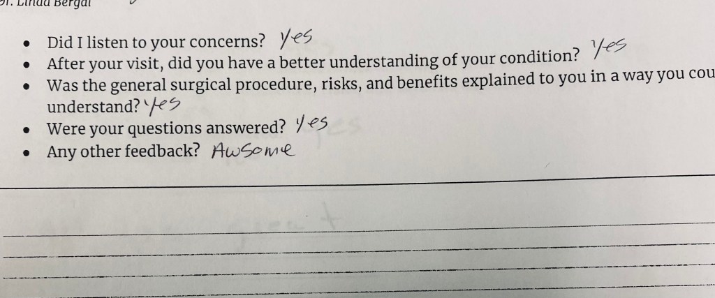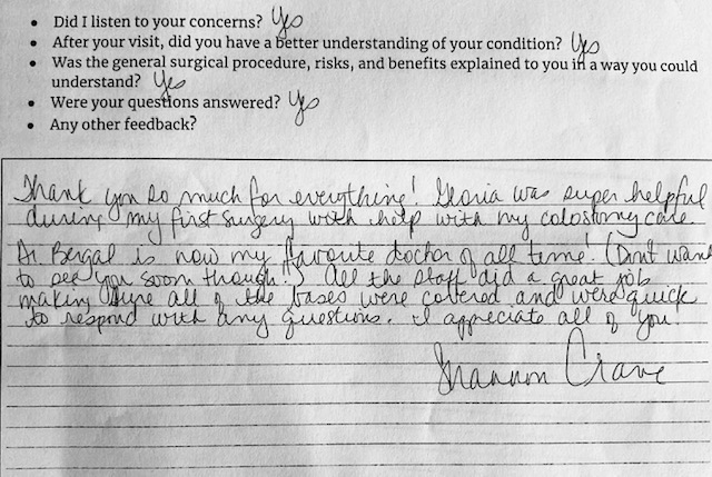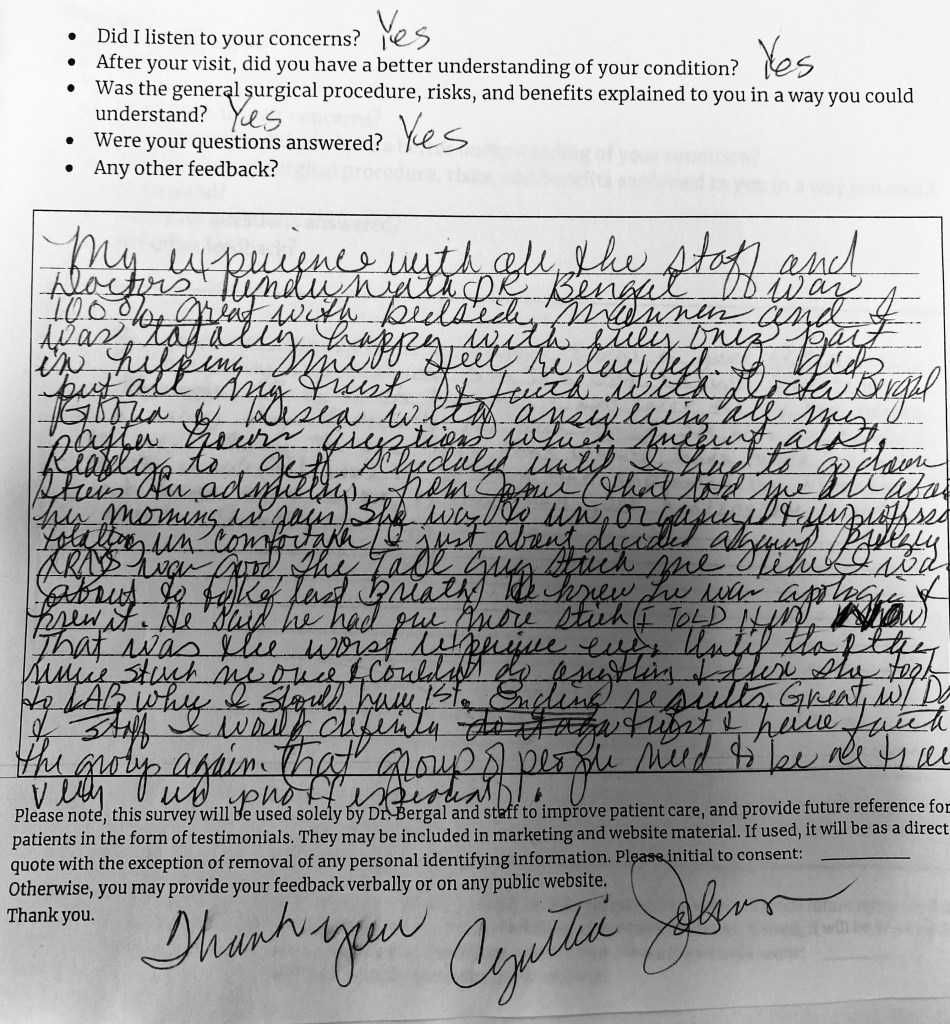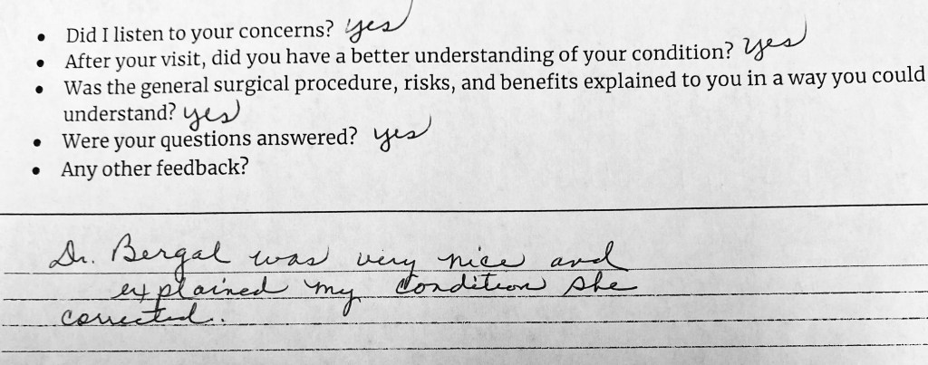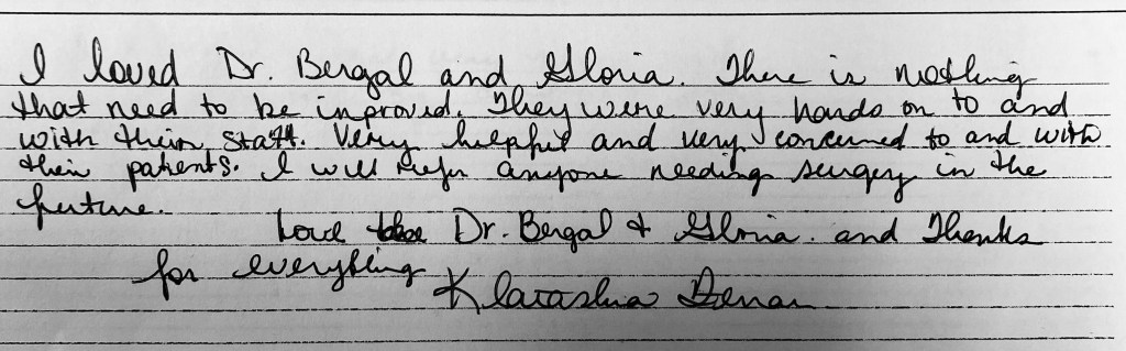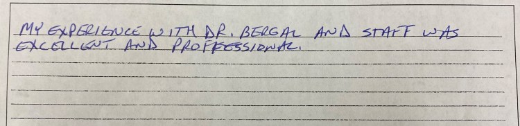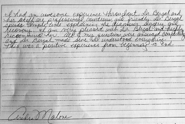 Highly recommend Dr. Bergal. Extremely professional and personable. She did a phenomenal job on my gallbladder surgery in May. Couldn’t have gone better.