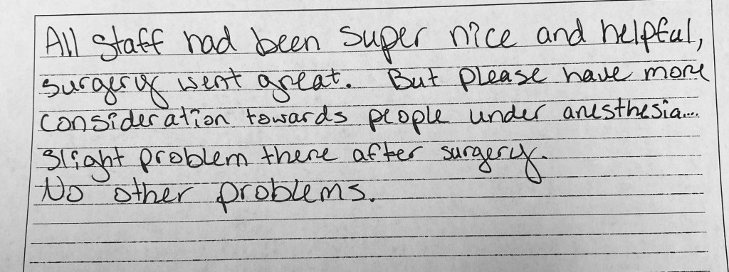 Dear Patient, thank you for your honest feedback. We have met with the recovery room staff and alerted them to your experience anonymously. We took the opportunity to remind all staff about the importance of patient privacy and the higher level of attention needed for those of us who care for patients while they are under sedation. We appreciate the great trust that each patient has to place in us and strive to live to a promise of excellence in your care.